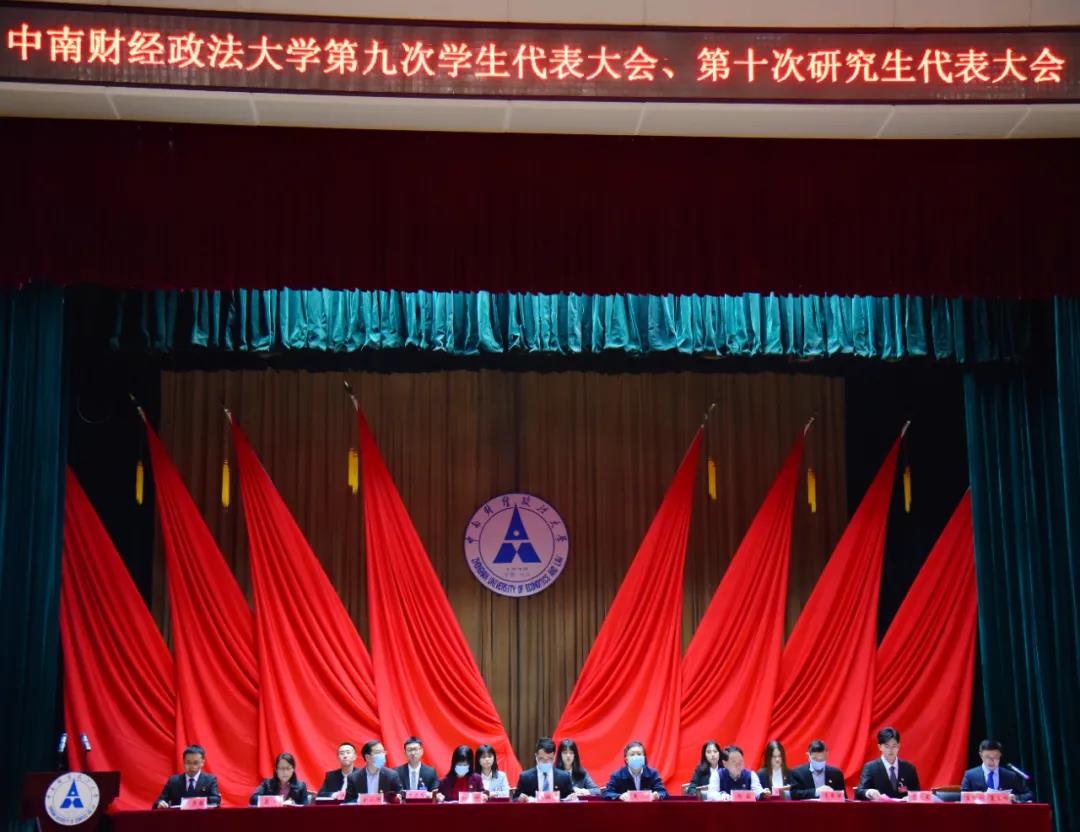 (通讯员 付慧娟 黄丽琼 瞿玉杰 贺婧 徐晨 毛姜娜)10月18日14时30分,中南财经政法大学第九次学生代表大会、第十次研究生代表大会开幕式在艺体中心音乐厅召开。湖北省学生联合会驻会执行主席任鹏飞,校党委常委、副校长覃红,校党委常委、组织部部长兼统战部部长刘琳琳,校党委常委、党委宣传部部长周巍,学生工作部部长余小朋,党委研究生工作部部长肖翠祥,校团委书记梁娜,各学院(中心)的党委领导、专职团干和研究生辅导员老师以及来自各学院(中心)的225名本科生代表、105名研究生代表出席本次大会。