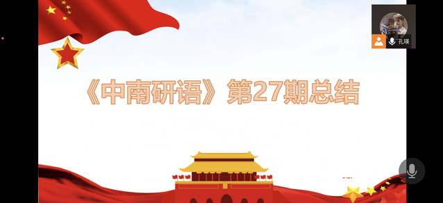 (通讯员 孔瑛)2020年11月15日晚6时,《中南研语》编辑部利用腾讯会议开展了“新中国史”学习交流会暨第28期报题大会。本次会议由常务副主编胡金叶和执行主编孔瑛共同主持,《中南研语》编辑部全体成员参加。