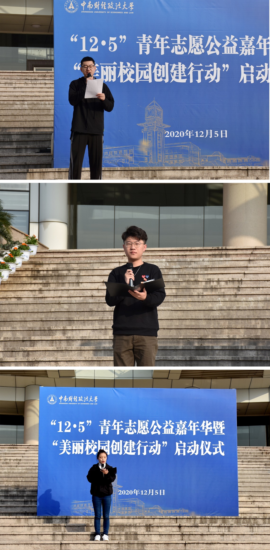 (通讯员 赵涵菲 贺婧 赵鑫)12月5日是国际志愿者日,为贯彻落实《中南财经政法大学关于全面加强新时代大学生劳动教育的实施方案》,引导全校同学学习践行马克思主义劳动观,牢固树立劳动最光荣、劳动最崇高、劳动最伟大、劳动最美丽的观念。2020年12月5日上午九点,我校在首义校区开展了第七届“12·5”青年志愿公益嘉年华暨“美丽校园创建行动”启动仪式,南湖校区设立分会场。