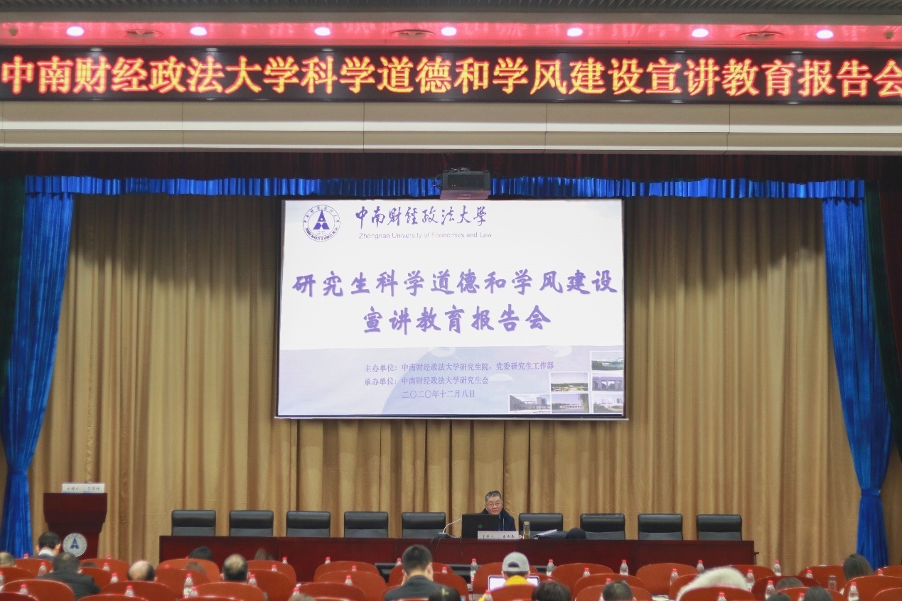 (通讯员 付慧娟 黄丽琼 毛姜娜 陈谦 赵鑫)2020年12月8日下午2点半,由研究生院、党委研究生工作部主办,校研究生会承办的2020年科学道德和学风建设宣讲教育专题报告会在文泉楼报告厅成功举办。受校党委常委、副校长姚莉教授的邀请,中南财经政法大学哲学院院长、博士生导师王雨辰教授就“科研道德与学风建设”这一主题做报告。各研究生培养单位分管研究生教育工作的院长(副院长)、分管研究生思政工作的书记(副书记)、2019年新聘博导、2020年新聘硕导、研究生辅导员以及各学院(中心)研究生代表参加了此次报告会。报告会由党委研究生工作部部长肖翠祥主持。