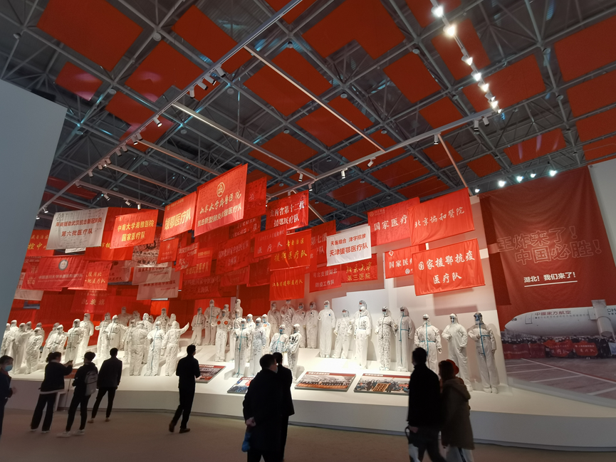 刚进入展厅,大家被习近平总书记会议进程安排展示所吸引,长达数月的时间轴展示令大家深刻感受到中共中央统筹全局、高效决策、英明指挥的大国风范。在六大主题内容展区中,展览通过图片、文字、视频、模型和互动体验等多种表现形式,或是重现与时间赛跑、拯救新冠肺炎患者的医护人员冲锋场景;或是展现火神山雷神山医院建成背后的无数建设工作者凝聚的“中国速度”;或是陈列金银潭医院院长张定宇院长受获的“人民英雄”证书及奖章,讲述其背后的故事;或是讲述此次疫情期间献出宝贵生命的英雄们的事迹。