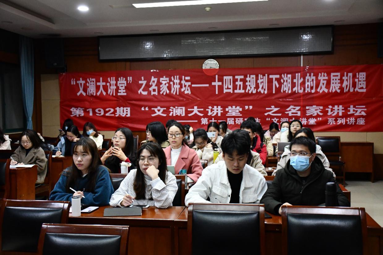 (通讯员 程明梅 唐知怡 王一帆)2021年3月22日晚上19时,由中南财经政法大学研究生院、党委研究生工作部、中南财经政法大学研究生会主办,中南财经政法大学财政税务学院研究生会承办的第192期“文澜大讲堂”之名家讲坛在文泉楼北403会议室顺利举行。本次讲座邀请了中南财经政法大学教授、湖北省统计局副局长、湖北省财政学会理事叶青教授,为师生做题为《“十四五”规划下湖北的发展机遇》的报告,讲座吸引了众多师生积极参与。