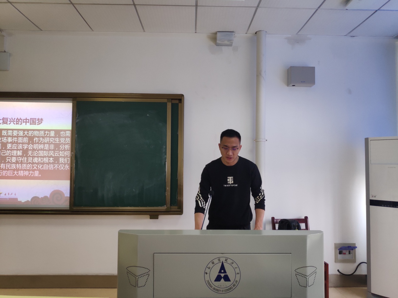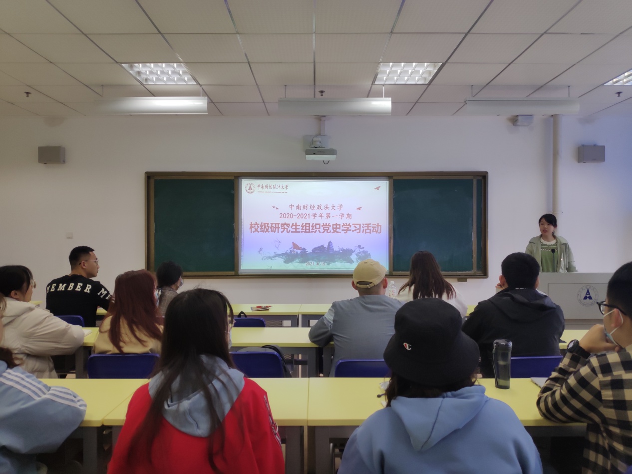(通讯员:计康凌 贺婧 赵鑫 摄影:毛姜娜)为庆祝中国共产党成立100周年,深入学习贯彻习近平新时代中国特色社会主义思想,全面落实中共中央、教育部及湖北省委关于开展党史学习教育的文件精神,从党的百年奋斗历程中汲取继续前进的智慧和力量,我校于2021年4月15号下午2点在文澴楼523教室开展了校级研究生组织党史学习教育。本次活动以“忆党史、铭党恩,强党性、促党建,肃党纪、正党风”为重点,旨在创新活动方法,丰富实践载体,引导学生干部增进爱党之情、常怀忧党之心、恪尽兴党之责,激励研究生干部讲好党的故事、革命的故事、英雄的故事,厚植爱党、爱国、爱社会主义的情感,充分发挥党史以史鉴今、资政育人的重要作用。本次活动由工商管理学院2019级博士研究生卢泓钢主讲,校研究生会主席团成员张启迪主持,校研究生会主席团成员、各职能中心负责人及校研究生会成员代表参加。