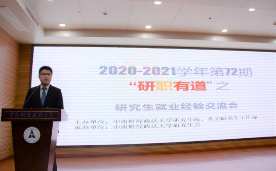 (通讯员:朱明耀 余艺伟 赵鑫)为引导广大研究生充分了解就业形势,树立正确择业观,科学合理规划职业生涯,掌握求职技巧,提高就业核心竞争力,实现更高质量、更加充分的就业,我校于2021年4月22日晚7时在文澴楼同声传译会议室成功举办了第72期“研职有道”研究生就业经验交流会。本次交流会由研究生院、党委研究生工作部主办,校研究生会承办,邀请了来自不同专业、不同就业方向的五位优秀研究生代表彭跃龙、刘旺、承前、郭敏和张依帆作为主讲人,与现场各学院(中心)200余名研究生分享升学和求职就业经验。本次就业经验交流会由校研究生会主席团成员陈明威主持。