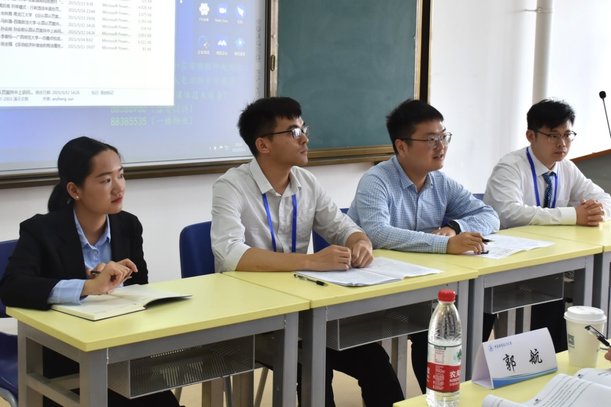 周苏湘博士围绕“列举模式:行政违法未遂处罚立法的修正方向”这一论文进行了汇报发言;宋林霞硕士深入探讨了“论认罪认罚案件差异化证明标准”的相关内容;冯科臻博士以“认罪认罚案件量刑建议的提出模式”这一论题进行发言。针对以上作者的发言,由郭航老师发表了论文汇报的探讨意见与个人的中肯看法。