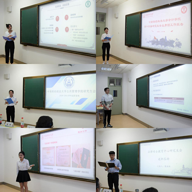 15个学院(中心)的研究生会依次就本学年工作进行了述职答辩。马克思主义学院从党史教育、学术品牌、文体实践、就业服务四个方面展示了学年工作成果;哲学院以时间轴为序介绍了以“国外马克思主义基本理论研究”学术研讨会为代表的学生活动;经济学院就研究生会组织和思想建设以及文体特色、学术品牌和生活服务等方面展开汇报;财政税务学院以“凝心聚力、锐意进取”为汇报主题,展现了全院提供“财税智慧”、贡献“财税力量”所进行的“财税探索”;金融学院以热干面为喻,对研会组织建设和形象展示、学术交流和文体特色进行了展示;法学院突出介绍了自办刊物《中南法律评论》的办刊情况和华中八校模拟法庭对抗大赛举办的情况;刑事司法学院则重点展示了服务研究生全面发展方面和研究生权益代表与维护方面的工作;外国语学院简要介绍了院研究生会的整体情况,特别讲述了“五育并举”工作举措并对未来工作进行了展望;新闻与文化传播学院着重介绍了配音大赛、知识竞赛等献礼建党百年系列活动;工商管理学院以详细数据展现了本学年开展的活动情况以及所获荣誉情况;会计学院从思想建设、文化建设、生活服务等方面汇报了院研会的整体情况;公共管理学院通过工作成果展示充分体现了院研会的工作宗旨、工作主题和工作目标;统计与数学学院重点介绍了为加强研究生爱国爱党情怀和集体荣誉感开展的红色文化演讲比赛、文体活动等工作情况;信息与安全工程学院展示了该院“一团五部”的组织架构,重点围绕“中南大工程研会”微信公众号宣传平台的建设介绍了研会工作。