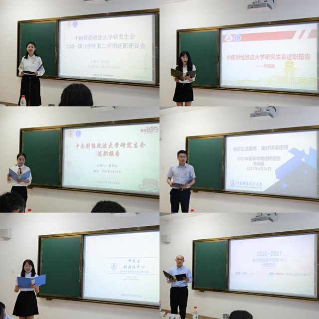 (通讯员:付慧娟 黄丽琼 彭杨 朱明耀 赵鑫 摄影:王童童)为迎接中国共产党成立100周年,展示研究生党史学习教育成果,深入贯彻落实《中华全国学生联合会章程》、《关于推动高校学生会(研究生会)深化改革的若干意见》等文件精神,全面客观评价研究生会的工作,加强校院两级研究生会建设,激发研究生干部责任担当,我校于2021年6月24日下午在文澴楼515教室举行了研究生综合表彰评选答辩会暨2020-2021学年第二学期述职评议会。