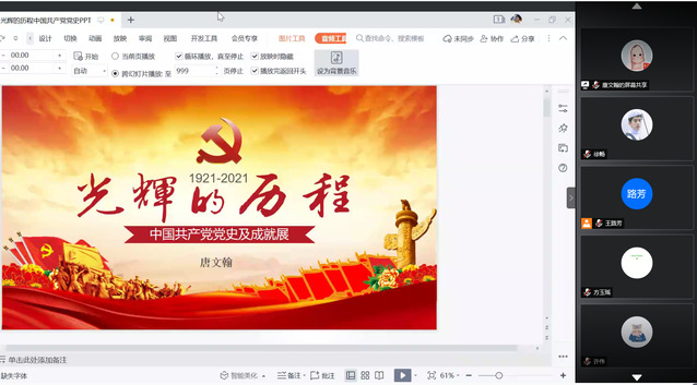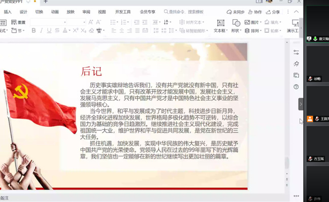(通讯员:徐畅 郑力源)6月21日18:00,我校博士研究生宣讲团成员唐文翰受邀为哲学院2021届全体本研毕业生开展了主题为“光辉的历程——中国共产党党史及成就展”的主题教育活动,本次活动采用腾讯会议作为线上平台开展。本次教育活动由哲学院研办、学办组织,学院老师和2021届全体本研毕业生参加了本次党史学习教育。