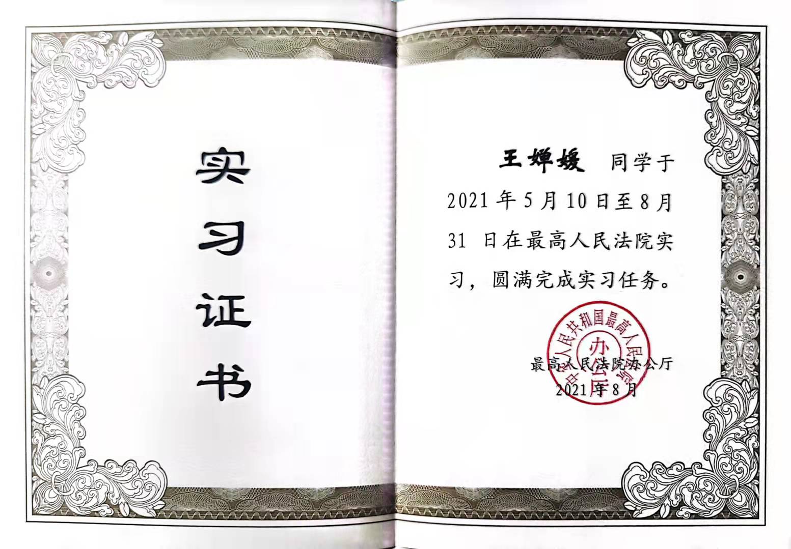 2021年8月31日,最高人民法院第十批法律实习生正式结束为期近四个月的实习工作。经各实习单位严格按照标准和条件推荐,我校法律硕士教育中心2019级硕士研究生王婵媛荣获由最高人民法院办公厅、政治部、机关党委组织评选的“优秀法律实习生”荣誉称号。据悉本批来自全国法律院校实习生共64名,实习期为2021年5月至8月,其中30名获得“优秀法律实习生”荣誉称号。