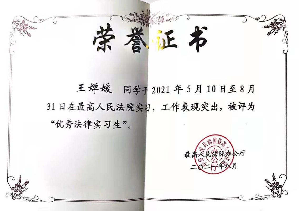 最高人民法院法律实习生制度是贯彻落实习近平总书记关于青年工作和法治人才培养重要论述的具体举措。王婵媛同学作为我校推荐的最高人民法院第十批法律实习生,在实习导师的指导下,参与了辅助审判、司法调研和综合行政等工作,并获评“优秀法律实习生”荣誉称号,不仅从实践层面展现了我校与最高人民法院的密切合作与交流,亦充分体现了我校优秀研究生过硬的思想政治素质、较强的司法实践能力与沟通组织能力。