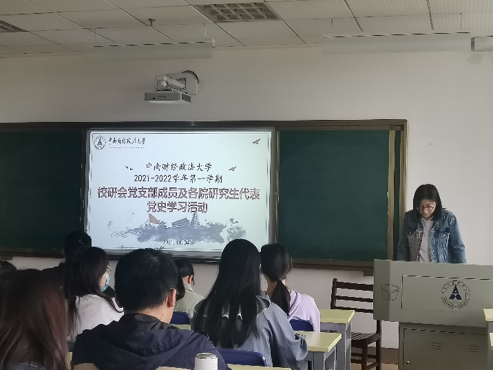 为深入学习贯彻习近平总书记在党史学习教育动员大会上的重要讲话精神,推进党史学习教育走深走实,充分发挥党史以史鉴今、资政育人的重要作用,我校于2021年11月4日下午在文澴楼515教室开展了研究生党支部党史学习教育宣讲接力第五讲。本次宣讲由法律硕士教育中心2003班学生党支部成员和2004班学生党支部成员主讲,马克思主义学院研究生党支部成员石韫辉主持,校研究生会党支部成员、各学院(中心)研究生代表参加。