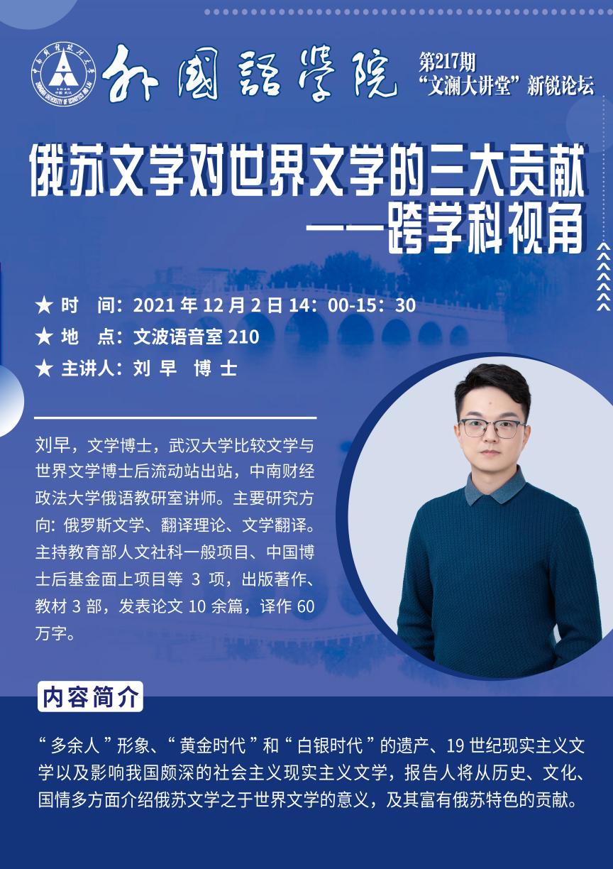 (通讯员 张冉 陈炫宇)2021年12月2日14:00,由中南财经政法大学研究生院、党委研究生工作部中南财经政法大学研究生会主办,外国语学院研究生会承办的第217期“文澜大讲堂”之新锐论坛在文波语音室210举办。本次讲座主题为“俄苏文学对世界文学的三大贡献——跨学科视角”,主讲嘉宾为外国语学院俄语教研室教师刘早博士。