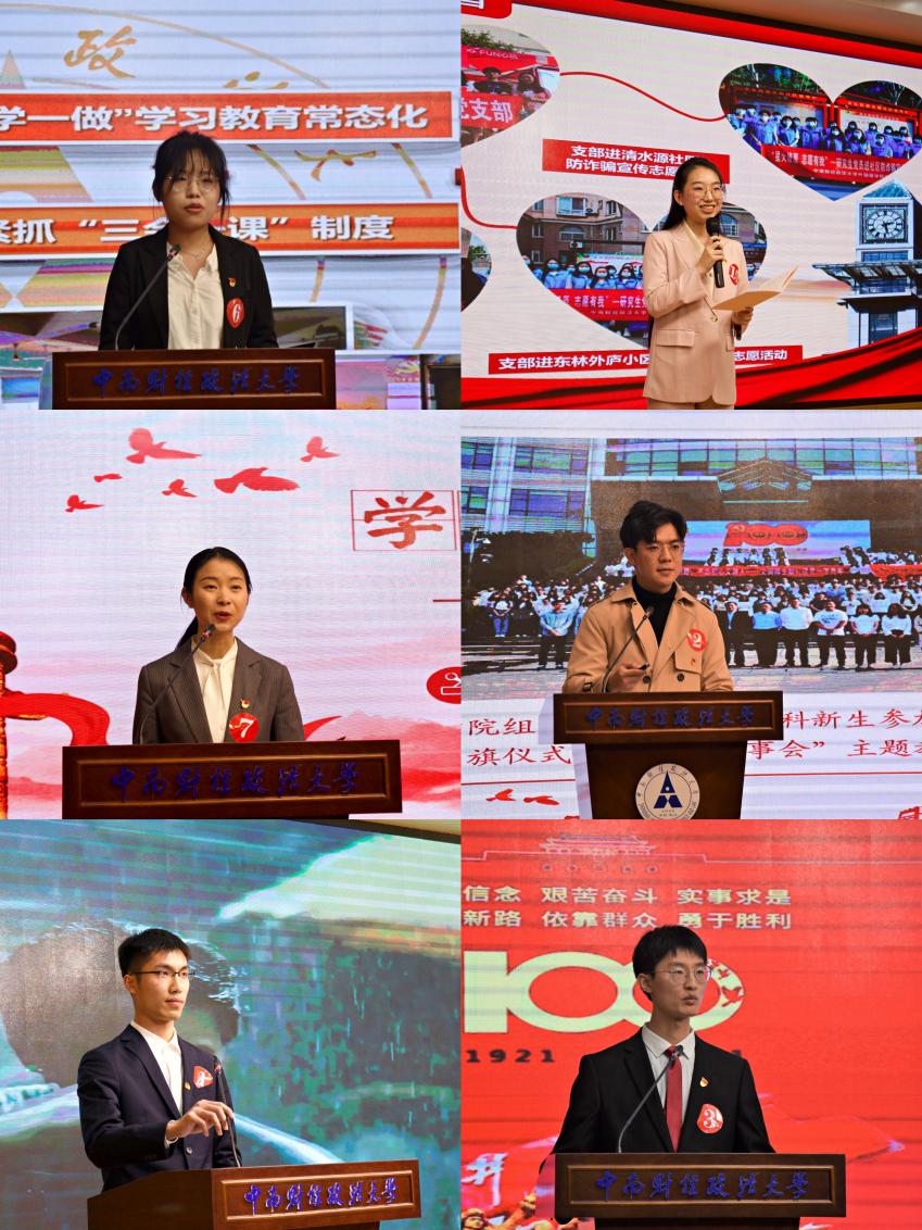 在展示汇报环节,2020级统计与数学学院学硕党支部以“共享大数据视角、精准化提升党员教育实效“为主题,从支部基础建设、完善党建体系架构、建设统数品牌活动三个层面出发,立足大数据视角与学科特色,构建“学习型、服务型、创新型”支部;以“听说读写译行,礼赞建党百年”为主题,外国语学院2020级研究生党支部结合外语专业特色,开展“读”党史,“听”党课,“说”外语,“译”文献,“写”所感,我先“行”等六大系列活动,坚持样板党支部建设“七个有力”的标准,打造红色基层战斗堡垒,全面开启礼赞党的百年风华之旅;工商管理学院硕士研究生2019级党支部围绕“百年献礼·红色领航”主题,以党建公众号为推手、以四史学习教育为契机、以优秀党员为标杆,着力打造“互联网+”党支部,走好“党建123”,以高质量党建引领支部高质量发展;新闻与文化传播学院2020级研究生党支部以“守初心 办实事——‘三牛’精神助耕党建田”为题,从支部基本情况、项目主要成果以及支部未来建设三个方面展开汇报,表示将进一步强化“服务+创新+奋斗”型支部建设,切实为同学办实事、解难题,不断发扬“三牛”精神。各研究生党支部代表围绕建党百年的时代主题,就自身项目的建设过程、建设成效、特色亮点、经验与不足等进行展示汇报。