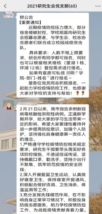 2月21日,面对武汉市新增新冠病毒核酸检测阳性病例这一突发疫情,学校各单位迅速作出响应。党委组织部及时成立由20名副处职党员干部组成的联系南湖社区工作队和应急突击队,参加社区管理和校园防疫工作;人事部组建教职工志愿服务队协助流调排查、食堂分餐、转运等工作;党委学生工作部、党委研究生工作部组建楼内、楼外学生志愿服务队,有序安排学生的信息录入、核酸采样、分餐、被隔离学生的课程信息统计等工作。