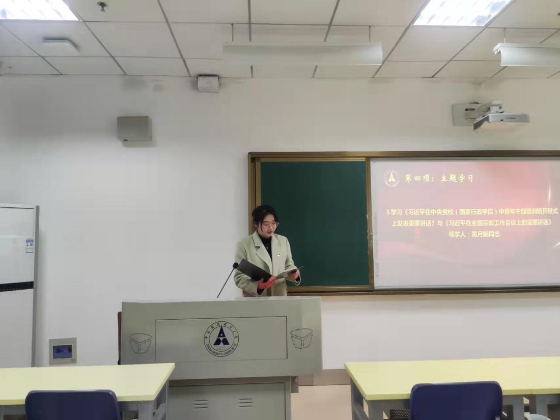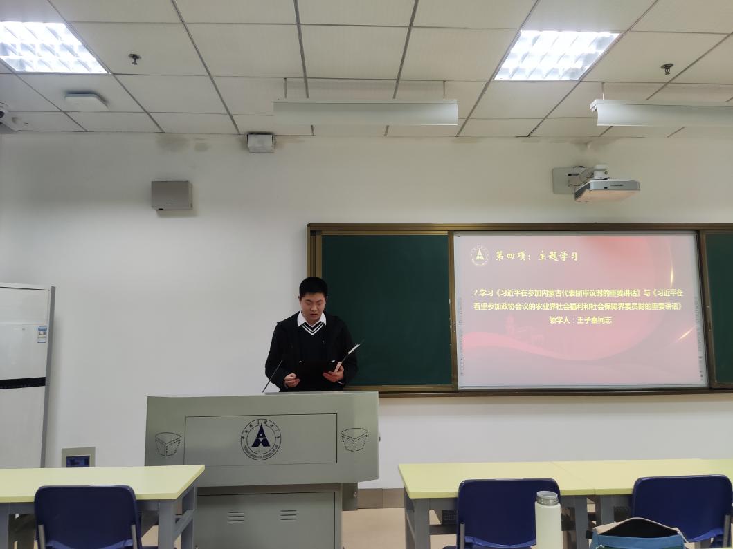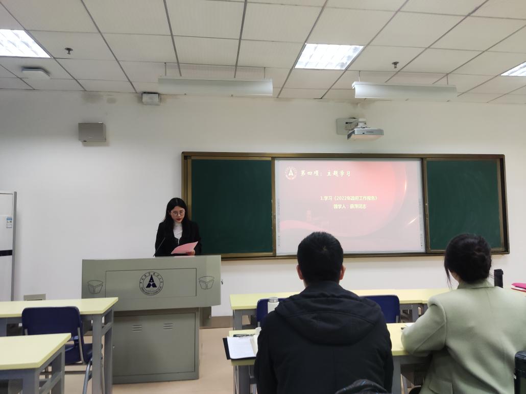 在主题学习环节,薛萍同志、王子秦同志、黄月鹏同志先后带领支部成员学习了《2022年政府工作报告》《习近平总书记在参加内蒙古代表团审议时的重要讲话》《习近平总书记在看望参加政协会议的农业界社会福利和社会保障界委员时的重要讲话》《习近平总书记在中央党校(国家行政学院)中青年干部培训班开班式上的重要讲话》及《习近平在全国宗教工作会议上强调:坚持我国宗教中国化方向 积极引导宗教与社会主义社会相适应》。支部党员同志们回顾了在党中央领导下2021年我国所取得的瞩目成就,深刻认识中国共产党执政规律、社会主义建设规律、人类社会发展规律,深刻领会社会主义制度的优越性,纷纷表示将进一步贯彻落实习近平总书记重要指示和党中央重大决策部署,树牢“四个意识”、坚定“四个自信”、落实“两个维护”,筑牢理想信念根基,以奋发进取的精神状态投身全面建设社会主义现代化国家的伟大实践。
