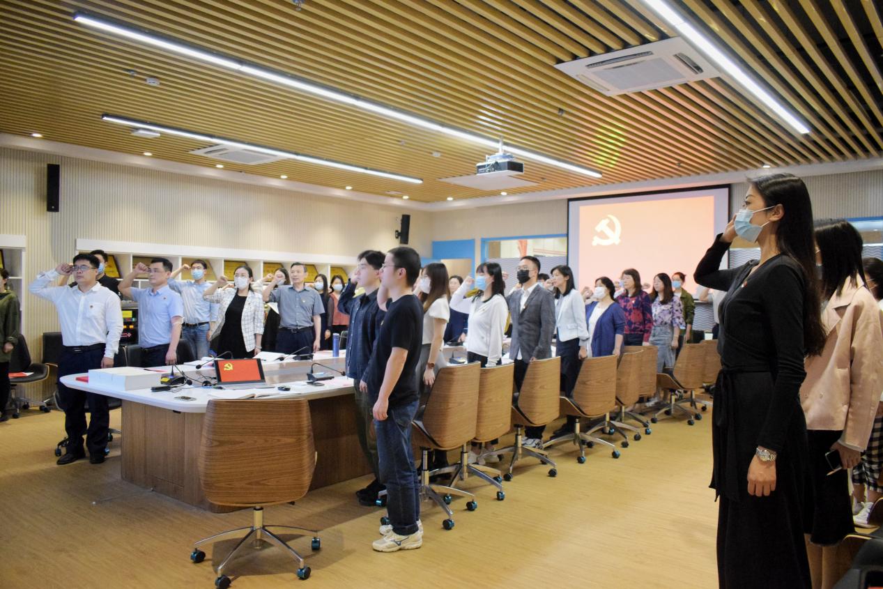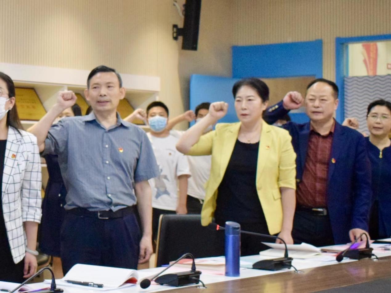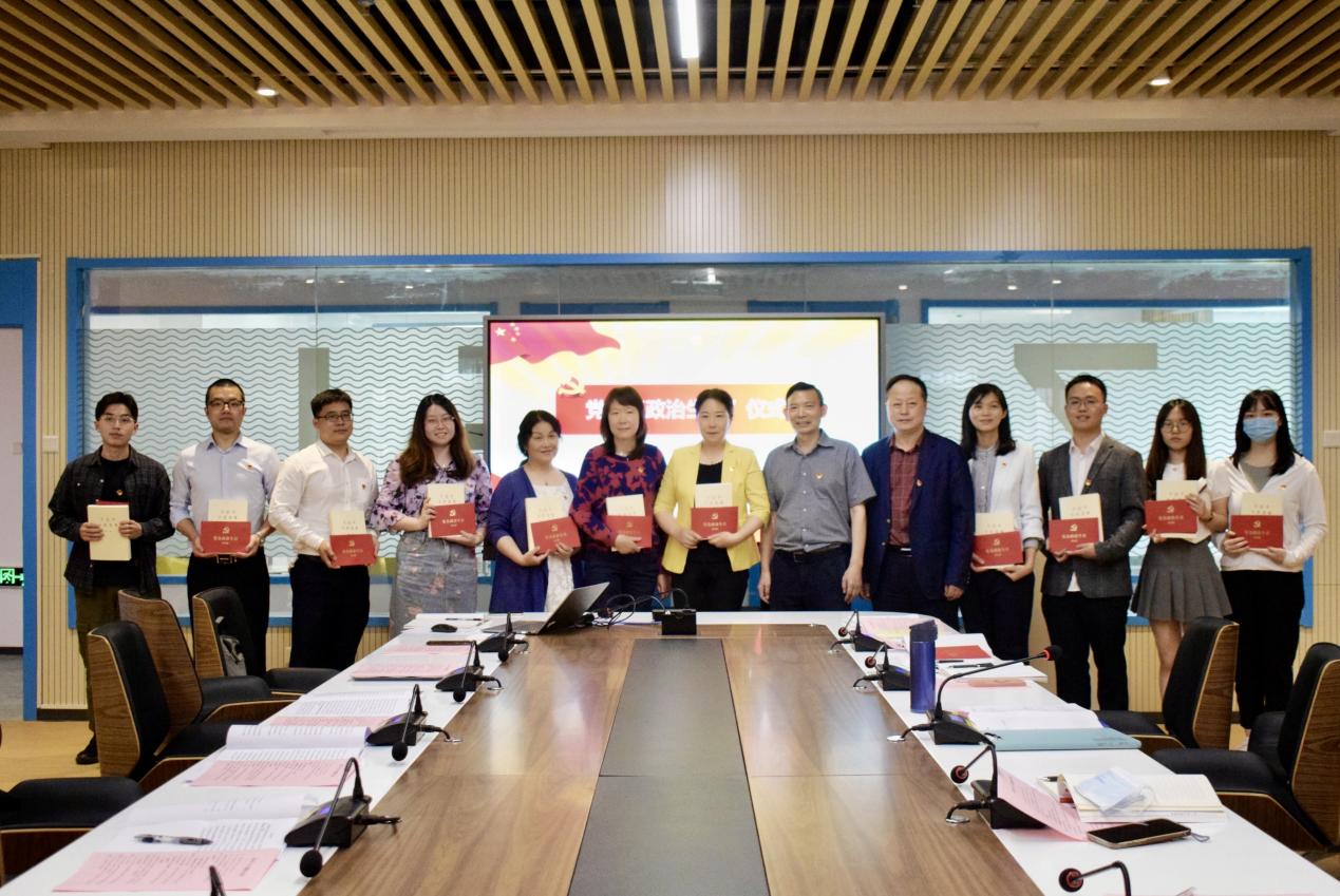 在政治生日仪式上,姚莉同志带领全体党员面向党旗庄严宣誓,向14位在第二季度入党的同志赠送政治生日贺卡和红色书籍并合影留念。