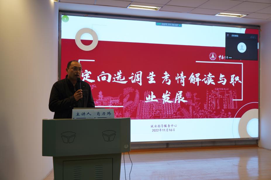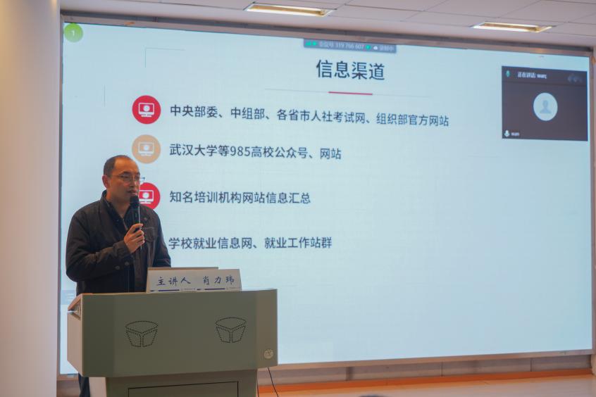 (通讯员 王济安 摄影 廉曜菖)为帮助同学们更全面、深入地了解选调生政策,科学合理地准备选调生考试,11月17日下午,法律硕士教育中心在文谭楼308以“线上+线下”的形式举办了“济世杯”职场礼仪大赛之定向选调生考情解读与职业发展讲座。本次讲座邀请到校就业指导服务中心肖力玮老师主讲,法硕中心团总支书记刘翔、辅导员余安琪、马晨娇出席本次活动,法硕中心和部分学院学生参加了本次活动。
