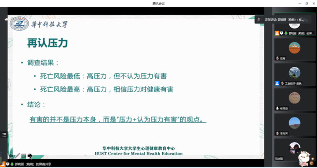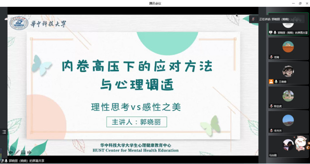 (通讯员:范瑶)为帮助新生尽快适应研究生生活,缓解学术科研等压力情境引起的情绪焦虑,通过积极的心理调适更好的应对“内卷”,2022年11月30日下午14:30,工商管理学院成功举办了“内卷高压下的应对方法与心理调适”心理健康专题讲座。本次讲座特邀请中国心理学会注册心理师、华中科技大学心理健康教育中心副主任郭晓丽老师结合当下最受学生关注的心理话题之一“内卷”进行分享,学院全体2022级硕士研究生参加。