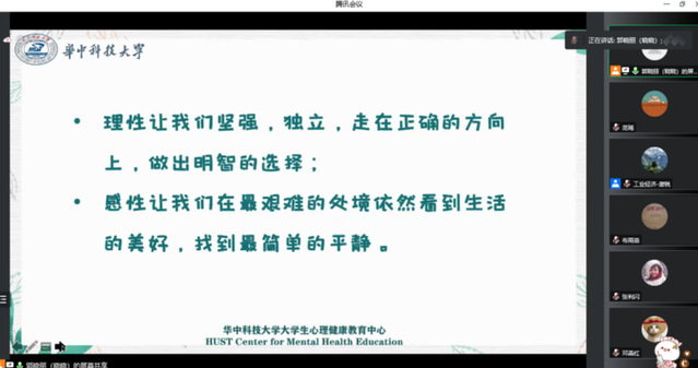 最后,郭老师以锚定效应为落脚点,告诉同学们要学会关注生活中自己喜欢的、擅长的、长远以来对自己有益的小事情,并能够珍视记录日常生活中发生的“好事”,进行正念冥想,减少内耗,及时表达对他人的喜爱与关心,以进行人际联结。长此以往,我们的心灵会通过与“美”关联而迸发更强大的生活智慧与力量。