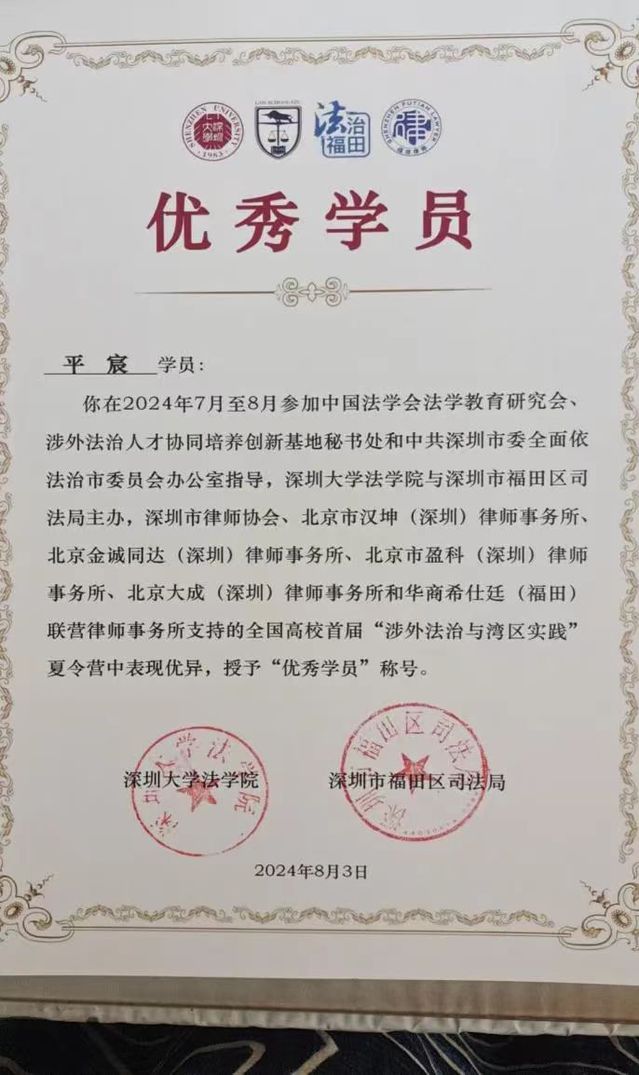 本次夏令营的活动内容十分丰富,深圳大学法学院和福田区司法局双方创新“府院联动”的活动组织模式,为有志从事涉外法律服务的法科学生精心策划了一场实践与理论并重的研学之旅。营员们奔赴14个研学地点,用脚步丈量深圳涉外法治的探索轨迹,与四十余位大咖促膝长谈,用心感受涉外法治建设的速度和涉外法律服务的广度。营员们在前海法院学习一线法律工作者的涉外法律查明等具体工作,在深圳国际仲裁院感受我国处理跨境商事纠纷先进经验,在腾讯总部、深圳数据交易所、河套合作区、平安金融中心感受粤港澳大湾区的科技创新发展速度,在五家前沿涉外律所与各位前辈交流学习体会、咨询职业规划,在深圳大学法学院人才政策宣讲等活动中探索未来可能性。法学院学子平宸踊跃参加活动,在小组汇报、专题展示中表现优异,获评本次夏令营“优秀营员”称号。