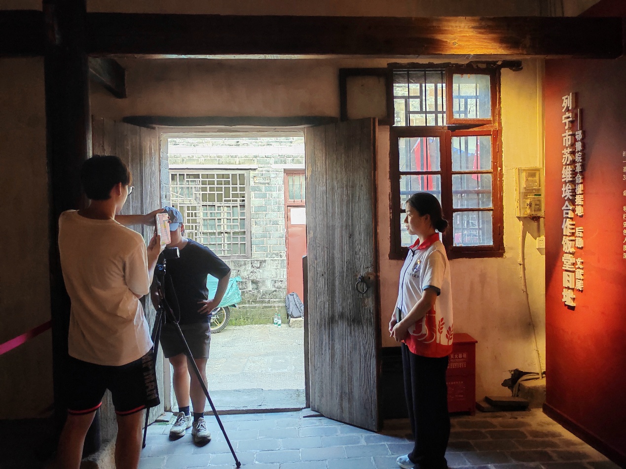 结合参观内容,实践团于此实地录制“商科青年·数字红韵”主题微党课。镜头聚焦青石板、旧门楣与革命遗存,青年学子立于先辈奋斗之地,将凝固的历史转化为可感可知的精神叙事。团队成员选择在革命旧址前,结合所见所思,讲述苏区经济建设的探索与实践,力求让历史故事更具现场感和感染力。
