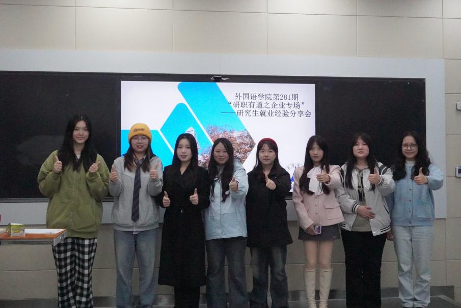 (通讯员 张冉)为促进外国语学院毕业生高质量充分就业,助力研究生明晰职业方向、掌握求职要领,11月6日下午,外国语学院在文波楼110智慧教室举办第281期“研职有道”企业专场——研究生就业经验分享会。本次活动邀请外国语学院2026届已签约毕业生吕成慧、邹雨薇主讲,外国语学院研究生工作办公室主任张冉和学院研究生代表参加。活动由外国语学院研究生会生活部负责人陈金星主持。