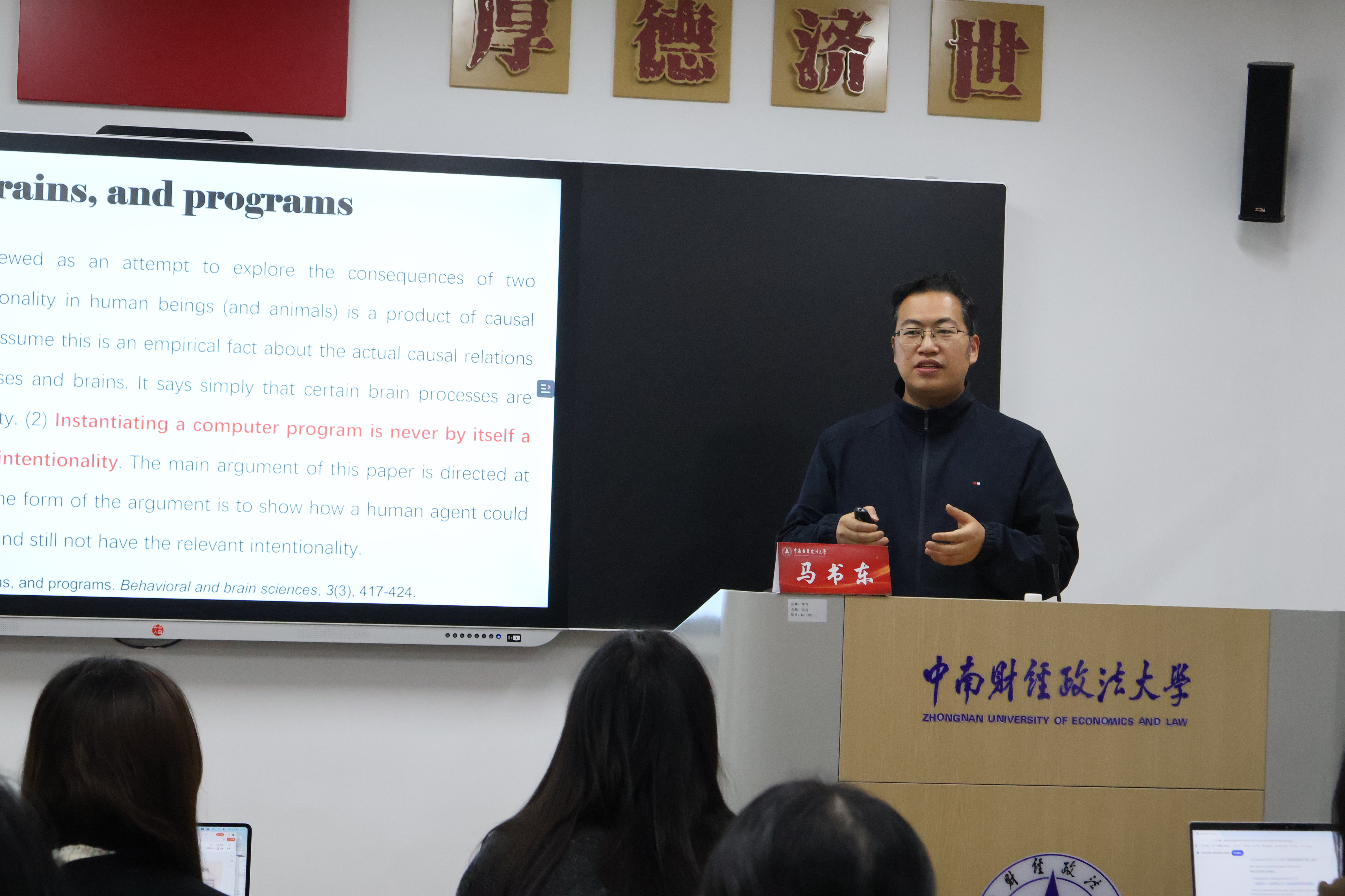 马教授介绍了“理想化认知模型”(Idealized Cognitive Models)这一重要理论工具,以及认知语言学的应用潜力:在语言与经济方面,通过“概念隐喻”分析经济现象,如“visible hand”“vanishing hand”;在语言与法律方面,利用“概念整合”理论分析法律文本;在语言与管理方面,引入“注意机制”换位思考,提升管理沟通效能。马教授现场演示了“千问”大语言模型思维方式,客观指出其局限性,强调人类思维在复杂语境中的不可替代性。