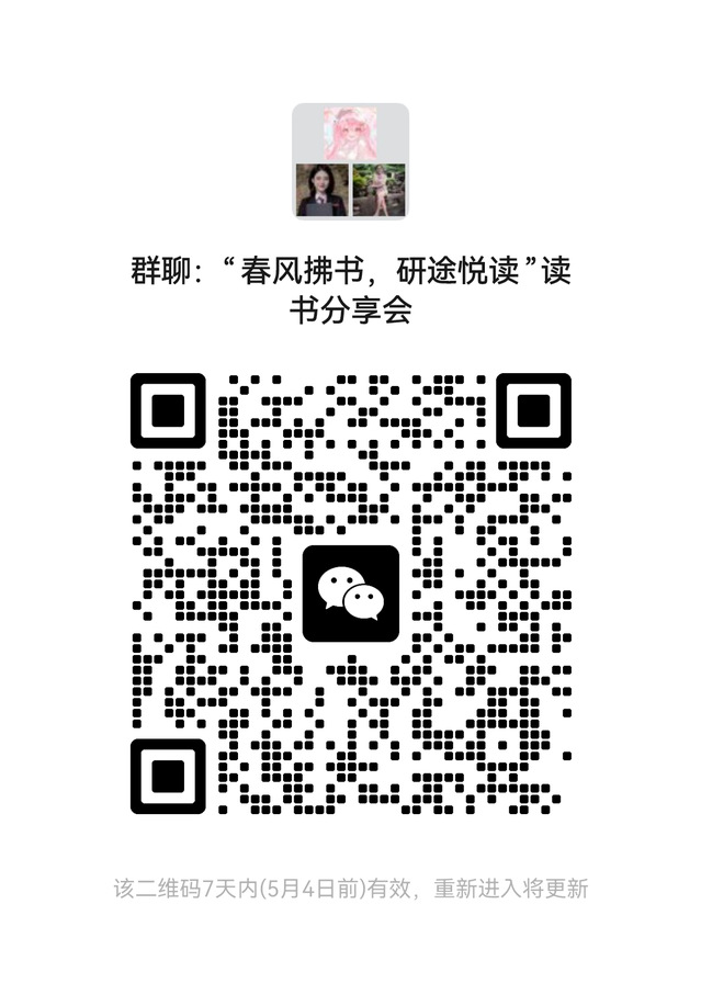【参与方式】请有意参加的同学于4月26日(周日)20:00前扫描下方二维码入群,后续会在群中发放报名问卷。人数有限,先到先得,鼓励结伴参与。