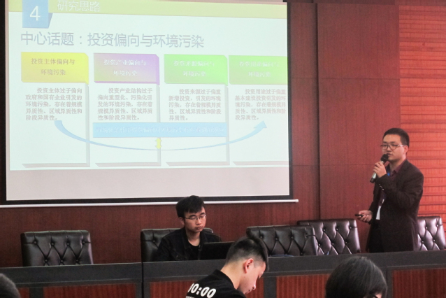 首先是由来自东南大学博士研究生刘晨跃上台发言,其论文题目为《中国的“环境污染之谜”——来自固定资产投资偏向性视角的解释》,刘晨跃博士首先介绍论文的研究背景、研究内容。接下来讲述了论文的主要观点和中心思想,本文是从固定资产的投资偏向性视角对于环境造成的污染做出了相关的回归检测和分析,论证了自己的相关观点。
