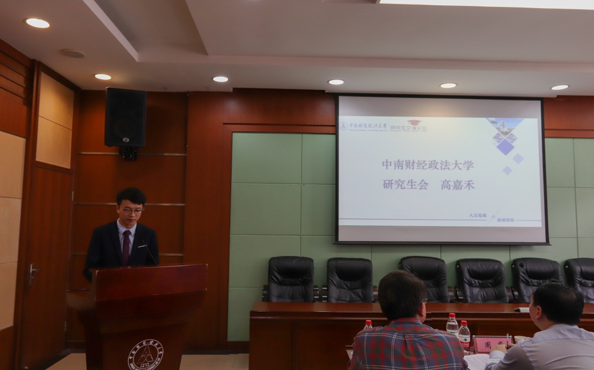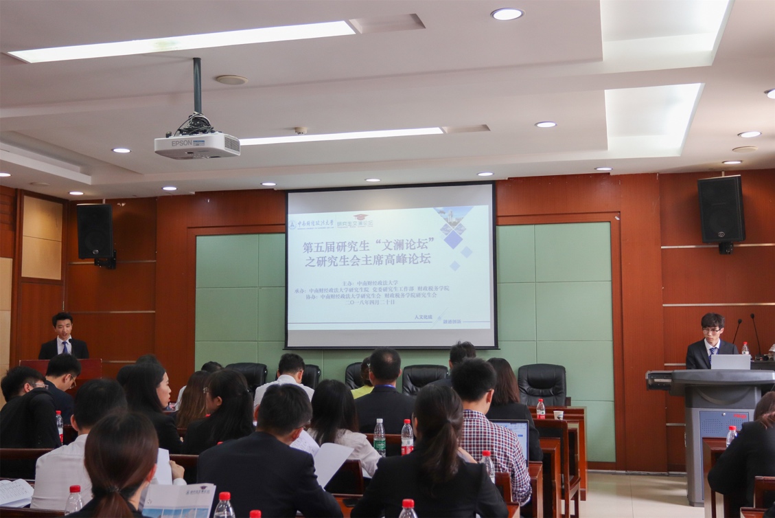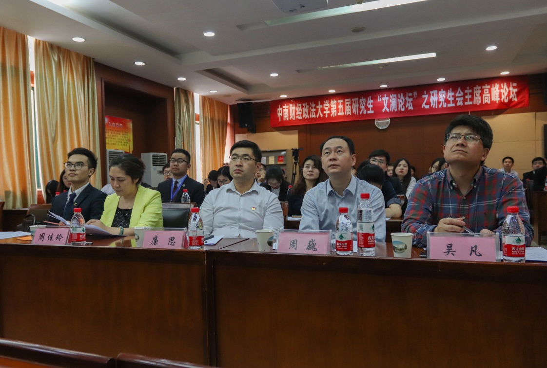 4月20日下午2时,我校第五届研究生“文澜论坛”之研究生会主席高峰论坛在文泉楼北楼403成功举办。本次活动由学校主办,研究生院、党委研究生工作部及财政税务学院联合承办,校研究生会、财税学院研究生会协办。共青团中央学校部副部长廉思教授,中南财经政法大学党委研究生工作部周佳玲部长、财政税务学院党委周巍书记、党委研究生工作部吴凡副部长、湖北省学生联合会驻会执行主席范安铭出席了此次高峰论坛,校研究生会主席高嘉禾以及来自全国30余所知名高校研究生会主席代表参加了本场会议,高峰论坛由校研究生会秘书长宁可主持。