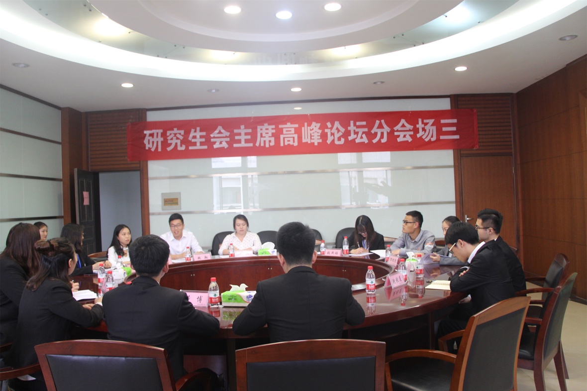 高峰论坛第四项,各高校主席代表们就如何发挥研究生会干部在研究生思想政治教育工作中的示范作用、如何优化研究生会组织制度建设、如何打造校内外学术交流常态机制等三个专题在分会场进行讨论。