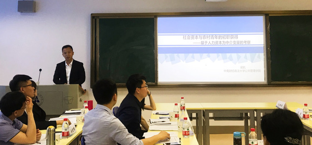 在论文报告环节,中南财经政法大学博士生冯鹏程首先分享了他的研究成果《从自动化到智能化:就业极化与收入不平等》,深入探究人工智能如何影响劳动力就业与收入格局。上海财经大学博士生吴义东的论文《住房公积金制度的福利效应研究:理论与测度》从理论到实证进一步探讨了住房公积金的财富分配问题。我校硕士生梁航的论文《社会资本与农村青年的初职获得——基于人力资本为中介变量的考察》则从社会资本视角探讨了社会资本如何影响农村青年的初职获得以及社会资本对初职持续时间的影响。中国人民大学硕士生黄政的论文《治理转型视域下的土地纠纷实践——基于华村的田野经验》通过田野调查对土地纠纷问题治理主体和治理规则的转型进行详细介绍。四位报告人发言后,赵丽江老师和徐双敏老师进行了点评,第一轮论文汇报结束。