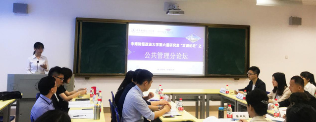 (通讯员 宋纯建 谢晓晓 董敏琳)2019年5月17日下午2点,由中南财经政法大学主办,中南财经政法大学研究生院、党委研究生工作部承办,中南财经政法大学研究生会、公共管理学院研究生会协办的第六届研究生“文澜论坛”之“公共管理”分论坛在文澴楼225教室顺利举行。我校公共管理学院博士生导师徐双敏教授、赵丽江教授受邀担任本次学术论坛的评议专家。12位优秀论文获奖者和我校优秀研究生代表参加了此次活动。本次活动主要分为三个环节:第一个环节是参会人员入场;第二个环节是由主持人进行开幕致辞;第三个环节是论文报告,分为三部分并由评议专家进行点评。在活动结束之际合影留念。