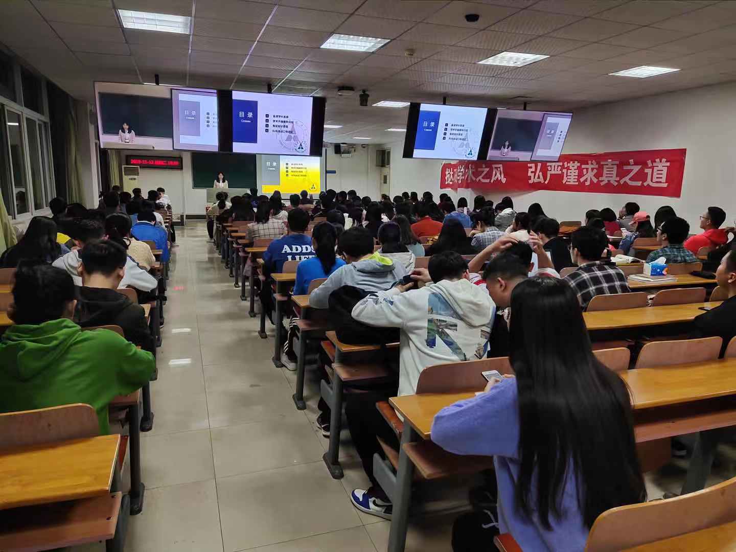 11月13日下午,金融学院学生会学术部组织2019级研究生在宿舍内共同观看《2019年全国科学道德和学风建设宣讲教育报告会》,会上指出,要弘扬科学精神,培养诚信的科研品行,踏实严谨的工作作风,切不可投机取巧,虚夸浮躁,绝不能伪造、篡改、抄袭触碰科研的“红线”。报告会深入推进“科学道德和学风建设”教育工作。