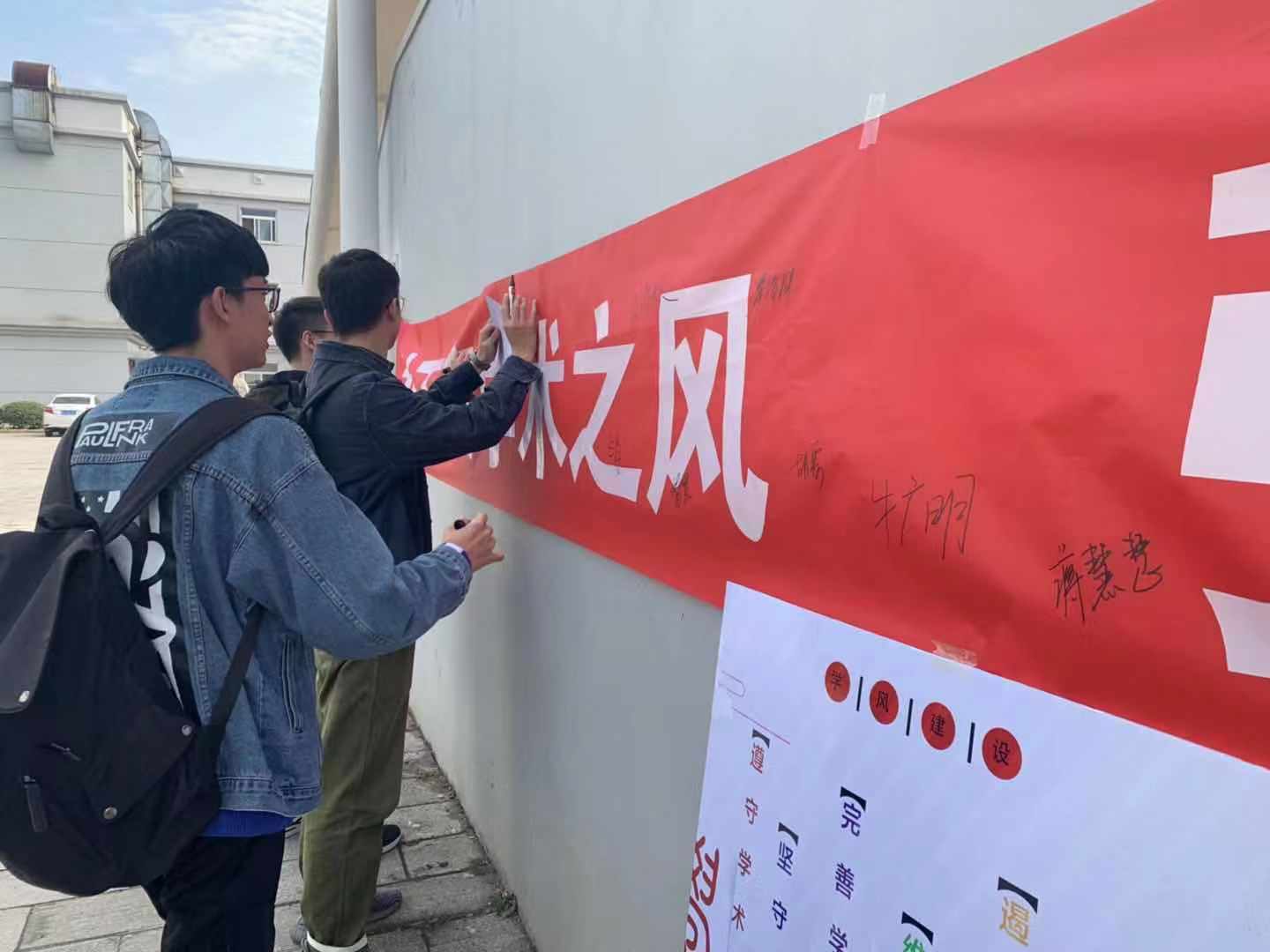 11月13日中午“共抵学术不端”横幅签名活动在十食堂门口进行,金融学院研会工作人员将标题为“挞不良学术之风,弘严谨求真之道”的横幅挂在白墙上,向往来学生递送学术不端宣传单,宣传“科学道德与学风建设”的初心,大家纷纷在横幅上签名,以表共建我校良好学术氛围的决心。