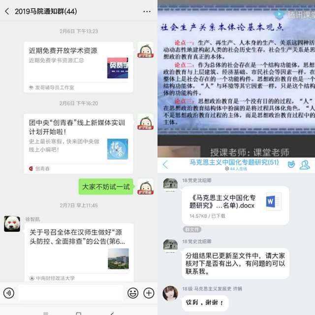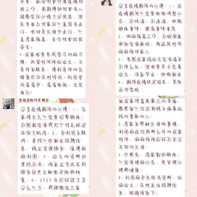 三个年级团支部分别组建一支“防疫联络队伍”,实行以寝室为单位各设一名负责人协助班级团支部开展健康状况摸排工作,每日对班级成员身体状况,宅家隔离情况等健康数据进行摸排,坚持“日报告”“零报告”制度,做到“守土有责、守土尽责”,关注班级同学宅家动态,将疫情防控工作落实到每位班级同学身上。同时,三个年级团支部也依据年级特点分别展开了线上的交流与分享,2017级团支部线上分享了学习生活经验,主要围绕于防疫期间毕业季的论文写作和工作求职等方面进行交流,即使宅在家中也时刻心系学业与工作;2018级团支部在线的“云”关心、“云”温暖,则有效帮助班级同学减缓疫情期间的焦虑与恐慌,在完成课业之余,积极动员班级同学开展丰富的“美食比拼”活动,一团面粉制作出形色各异的糕点,一道道菜肴秀色可餐,丰富疫情期间的日常生活,增强班级同学的动手能力;2019级团支部则主要围绕线上课程学习进行交流探讨,宅家也要重视完成课业的质量与效率,线上的专业交流与探讨,学习资源的及时发布,都为班级同学的学习提供了保障,不让疫情影响学业的进度。