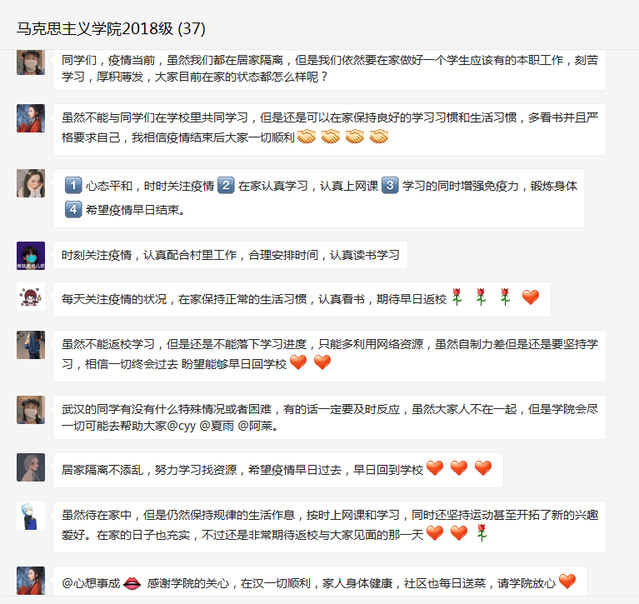 “疫无情,人有爱”,马克思主义学院各年级团支部充分发挥组织作用,积极动员班级同学自觉做好居家防护、养成健康的饮食生活习惯的同时,从中涌现的防疫志愿者团队面对疫情,敢于逆行,切实有效的落实疫情防控工作,携手抗“疫”,共克时艰,为配合打赢疫情防控阻击战贡献力量。