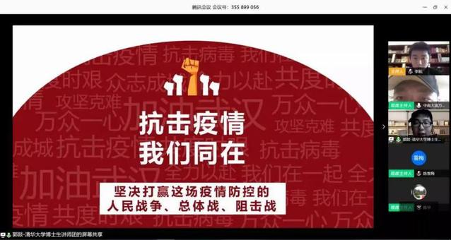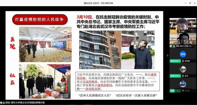两校两支部通过前期准备工作,扎实推进学生党员教育工作,使党的课程上线,党的活动在线,党员意识不离线。清华大学博士生讲师团成员、核研院博士研究生郭燚同志首先向大家分享了“习近平总书记关于疫情防控工作系列重要讲话精神”“习近平总书记在北京考察新冠肺炎防控科研攻关工作时重要讲话精神”“习近平总书记在湖北省考察新冠肺炎疫情防控工作时重要讲话精神”。并结合自身实际向大家阐明,疫情防控是一场有关民生的总体战,是一场需要统筹经济发展的总体战,更是关系全球与世界的总体战。郭燚同志表示,关键阶段,必须保持清醒和警觉,“外防输入,内防扩散”,精准施策,有序调整,不让疫情反弹,不断扩大战果,不获全胜决不收兵!苦难铸就辉煌,实干方可兴邦。