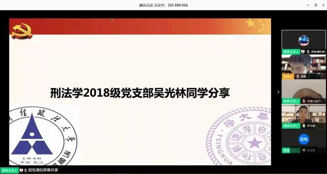 3月29日,在刑事司法学院党委的指导下,硕士生2018级刑法学党支部与清华大学鄂东学生临时党支部联合开展了专题组织生活会暨“同上一堂云党课”活动,两校两支部共40余名党员同志参加本次活动。活动由清华大学鄂东学生临时党支部书记、法学院2019级硕士研究生张航同志主持。
