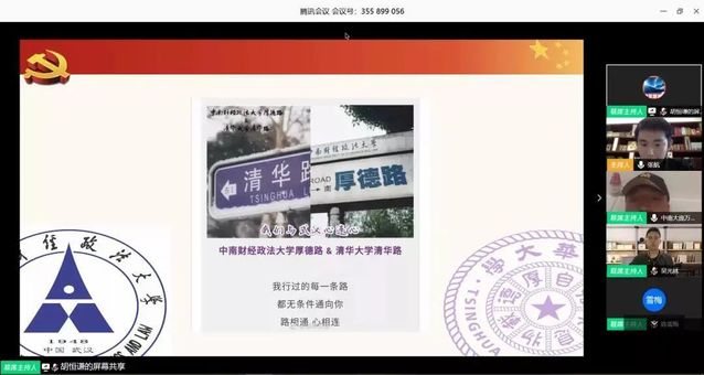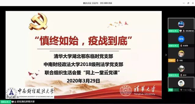 (供稿:张航 庞万腾)为充分发挥基层党组织战斗堡垒作用和党员先锋模范作用,确保疫情防控期间广大党员组织生活不停摆,坚持疫情防控和党的建设相结合,中南财经政法大学与清华大学两校两支部联合开展了专题组织生活会暨“同上一堂云党课”活动。这一活动还旨在探索“支部建在线上”新模式,将组织生活“线上过”与“硬要求”相结合,继续巩固拓展“不忘初心、牢记使命”主题教育成果,持续吹响党员示范带头集结号,以支部为堡垒、以党员为旗帜,检验党员同志疫情期间学习成果,凝聚疫情防控的强大力量,确保“开学不返校、组织生活不间断”。
