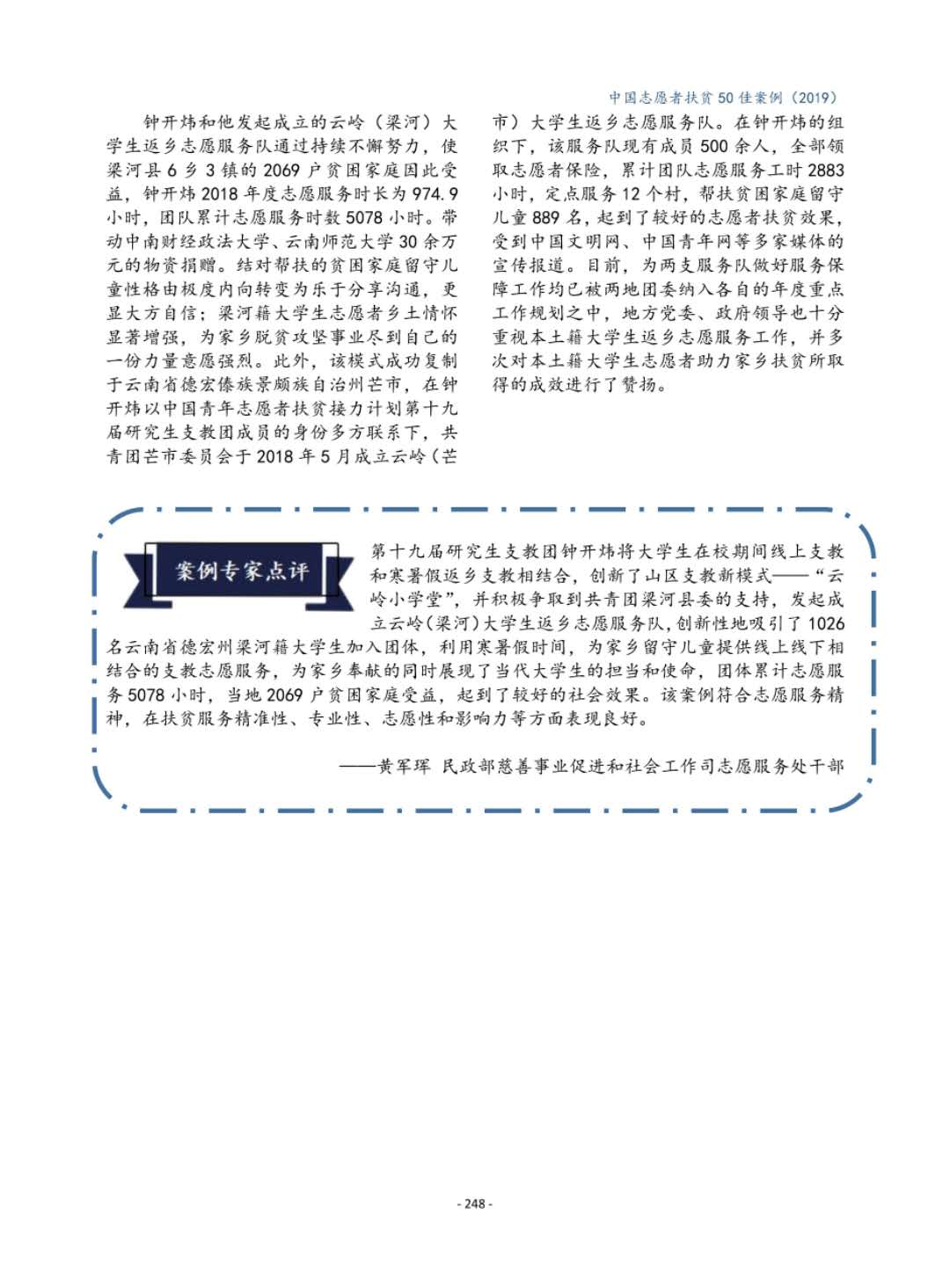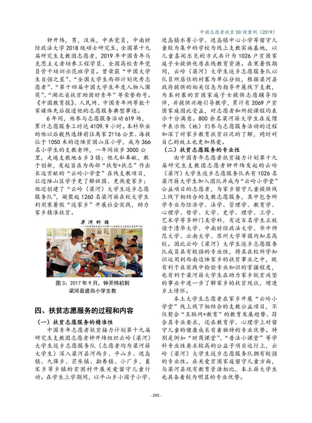 钟开炜同学是我校第四次党代会研究生党员代表,本硕均就读于我校公共管理学院行政管理专业。他从本科开始利用休息时间在乡镇兼职锻炼,参与基层精准扶贫工作,是我校在志愿服务和脱贫攻坚领域中的一名优秀学生党员代表,并多次在国家及省市平台中为校争光。2017年,钟开炜同学本科毕业,在学校的支持和鼓励下,他作为西部计划研究生支教团志愿者到云南梁河进行了为期一年的支教。在西南边陲,他在取得当地政府支持下,主动结合自己的专业所学,成立了云岭(梁河)大学生返乡志愿服务队。至今,云岭大学生返乡志愿服务队已有一千多名梁河籍在校大学生为家乡的脱贫攻坚事业助力,成效显著。2019年底,钟开炜同学的志愿扶贫案例入选国务院扶贫办评选的《中国志愿服务扶贫案例50佳》,是全国仅有的10位获奖者之一。钟开炜同学还曾获评“中国大学生自强之星”、“全国大学生西部计划优秀志愿者”、“中国大学生年度人物入围奖”、“湖北省新时代向上向善好青年”、“武汉市文明市民”、“洪山好人”等多项荣誉,主持及参与的项目获得国家省市级荣誉30余项。