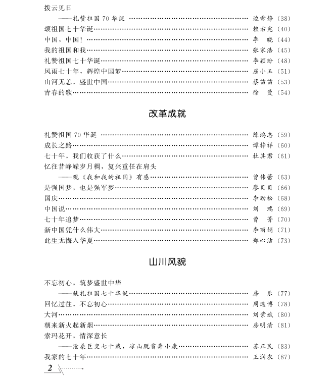 2019年是中华人民共和国成立70周年,亦是中南财经政法大学迁至武汉办学70周年。为回顾历史进程,展示辉煌成就,总结发展经验,传承红色基因,弘扬爱国爱校精神,用好党史、新中国史、改革开放史、社会主义发展史教育素材,进一步增强“四个意识”、坚定“四个自信”、做到“两个维护”,引导师生真正把爱国之情、强国之志转化为决胜全面建设成小康社会、夺取新时代中国特色社会主义伟大胜利的自觉行动中来,中南财经政法大学党委研究生工作部、学生工作部、校团委联合开展了“礼赞祖国70华诞”作品征集活动。同学们积极响应,共收到来稿332篇,其中研究生来稿61篇,本科生来稿271篇。经学校专家评审、出版社校对出版,作品集共收录作品95篇,其中研究生作品33篇,本科生作品62篇。