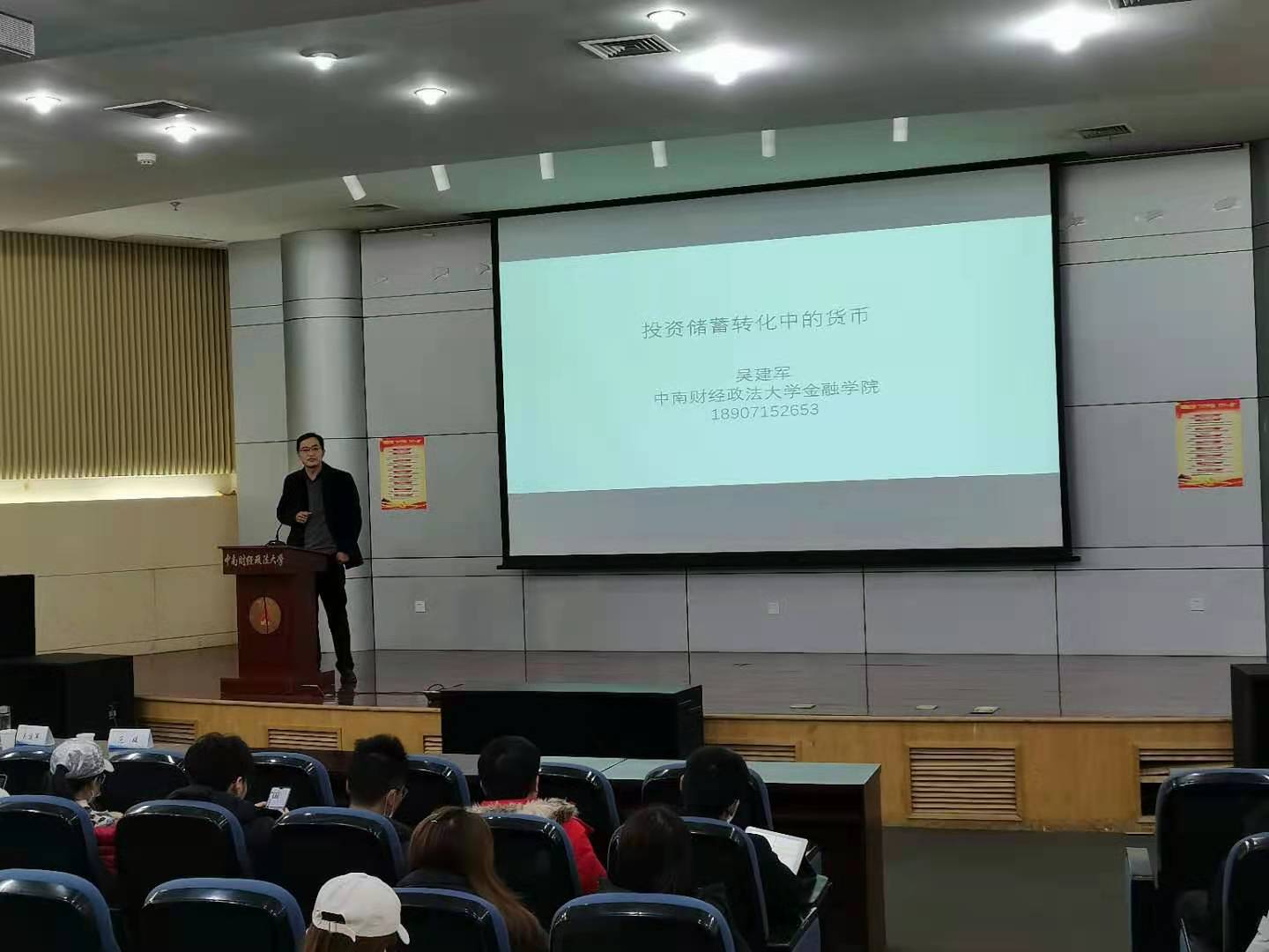 (通讯员 范媛 张瑞钰)2020年12月15日(周二)晚7:00,由中南财经政法大学研究生院、党委研究生工作部、中南财经政法大学研究生会主办,中南财经政法大学金融学院研究生会承办的第189期“文澜大讲堂”之名家讲坛在图书馆一楼报告厅如期举行。金融学院学术部部门成员张航主持此次讲座,主持人首先介绍了本次讲座主讲人——吴建军老师。吴建军教授是中南财经政法大学金融学院教授,华中科技大学经济学博士。兼任中国投资协会投资学科建设委员会理事、湖北创业学会理事、湖北省外国政府贷款项目专家评审委员会委员。吴教授主要讲授《投资学》(本科生)、《投资经济理论》(硕士生)、《投资学经典文献》(博士生)等课程。研究方向为投资理论与实践、实体经济与货币经济关系。此次讲座的主题是“投资储蓄转化中的货币”。