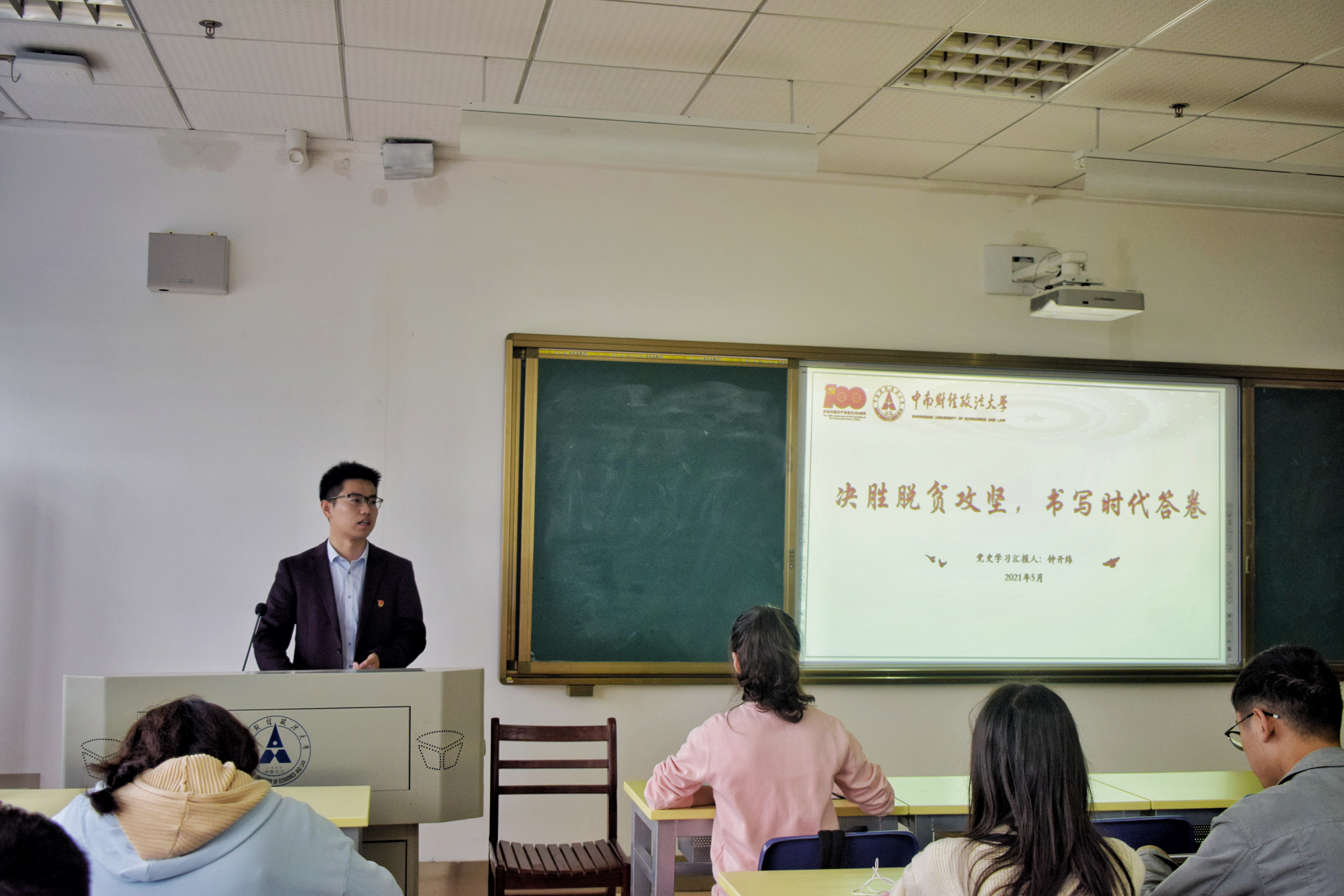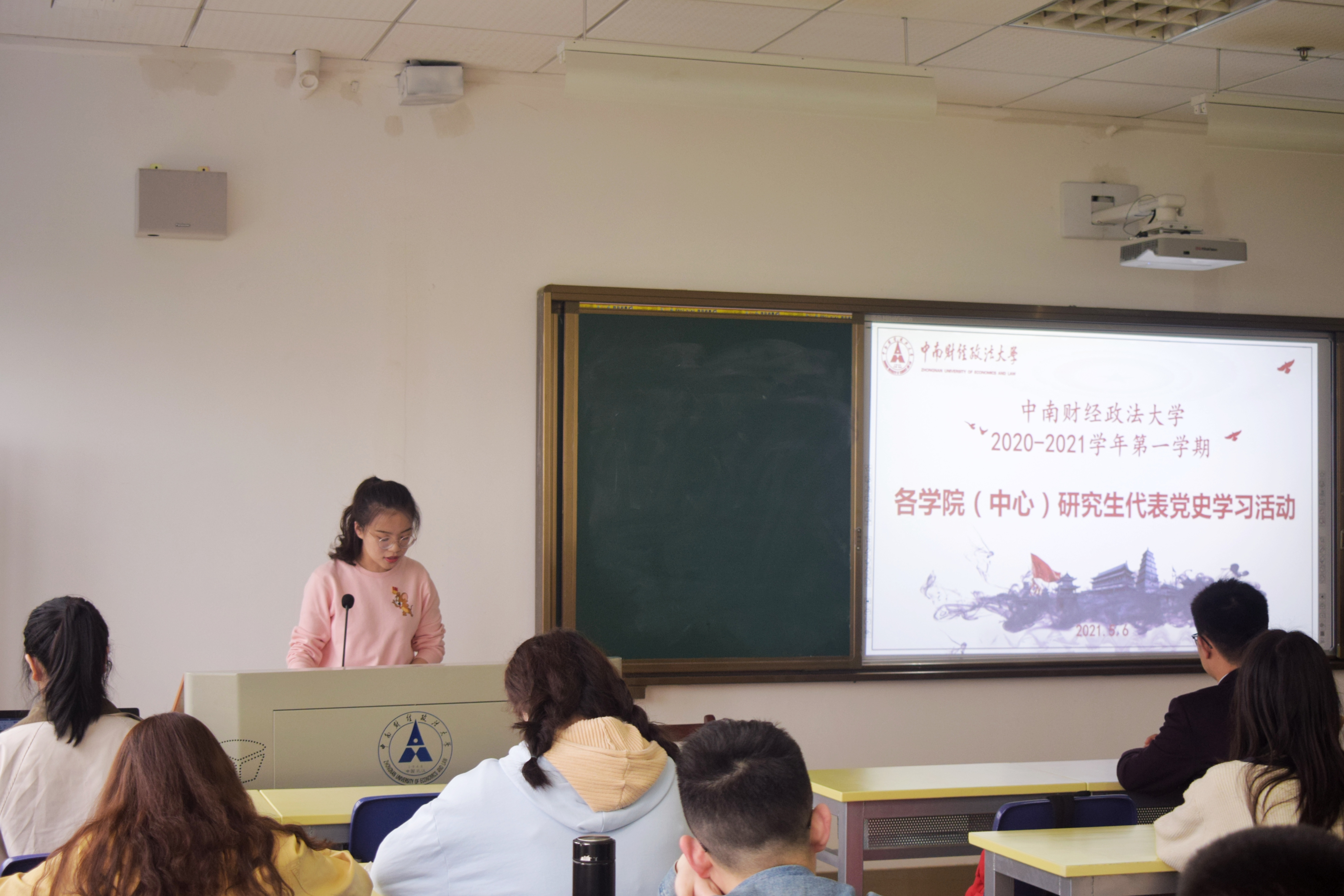 (通讯员:陶涛 摄影:彭杨)为庆祝党的一百周年华诞,进一步开展党史学习教育,充分发挥党史以史鉴今、资政育人的重要作用,加强思想政治引领,推动校园精神文明建设,引导研究生牢固树立“四个意识”,坚定“四个自信”,做到“两个维护”,培育当代研究生的理想信念与责任担当,我校于2021年5月6日下午3时在文澴楼517教室开展了全校研究生代表党史学习教育。本次活动由公共管理学院2018级行政管理专业硕士研究生钟开炜主讲,校研究生会主席团成员瞿玉杰主持,校研究生会主席团成员、各学院(中心)研究生代表参加。