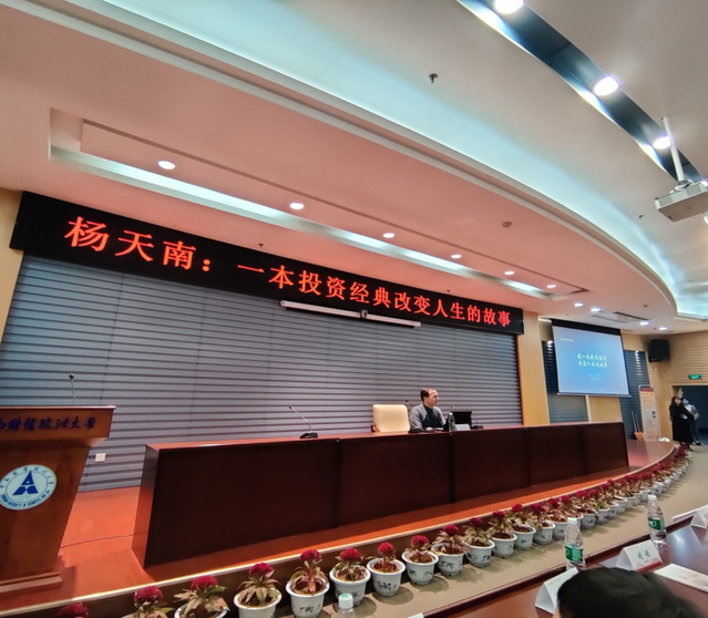 (通讯记者 范媛 吕泰亨)10月15日19:00,金融学院第204期“文澜大讲堂”之名家讲坛——第十二期研究生学术节系列讲座在中原楼7楼会议室顺利举行。本次讲座由金融学院李沛书记主持,主讲人为中南财财经政法大学客座教授杨天南,讲座主题为“一本投资经典改变人生的故事”,到场嘉宾有谭木匠集团代表王卉女士、江珊女士;复旦大学 EMBA崔振巍先生;母校贸经系教授张光忠先生等多位校友会成员;金融学院研究生辅导员范媛老师、180多位研究生与本科生参加此次讲座。