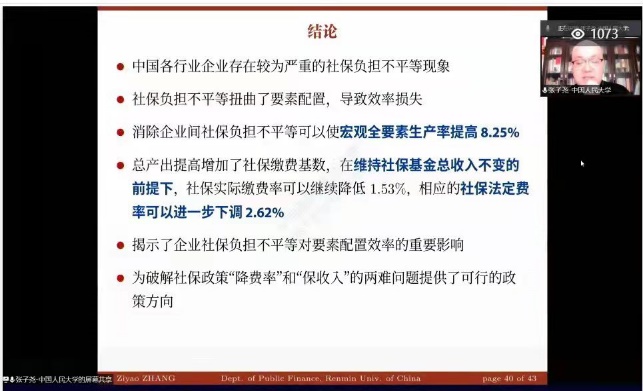 首先,中国人民大学张子尧博士分享了题为《社会保险降费政策空间有多大——企业社保负担不平等与要素配置效率视角》的论文。论文指出企业间社保负担存在不平等的现象,并且可以通过消除其中的扭曲在使社保费率降低的同时不减少社保收入。张子尧博士通过分析得出,消除企业间社保不平等的现象可以使宏观全要素生产率提高。同时,在保证社保基金总收入大体不变的情况下,允许社保实际费率和法定税率调低。中南财经政法大学财政税务学院刘庆助理教授对该论文进行了点评。刘庆老师认为,该论文十分具有指导意义,但对于企业行业内部所造成的社保差异现象、社保的不平等究竟是企业自我选择还是外因导致等问题上还可以进一步改进。