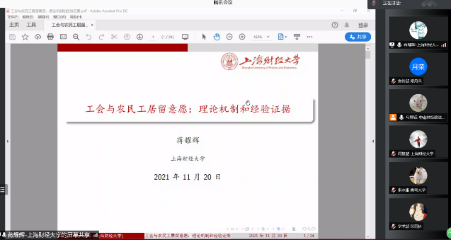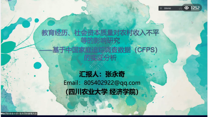最后,四川农业大学张永奇博士发表了《教育经历、社会资本质量对农村收入不平等的影响研究——基于中国家庭追踪调查数据(CFPS)的实证分析》的论文分析。文章以农村的收入不平等为背景,通过对CFPS数据进行回归后发现,农户教育经历提升使得农户间收入差距扩大,而社会资本质量的持续性有利于环节农村收入不平等的扩大现象,并具有较强的削弱作用。因此,为了缓解农村收入不平等的现象,应该强化农村居民的教育投入与拓展社会资本质量扩充途径,并增加对低收入群体的教育水平和社会资本质量提升路径的关注度。中南财经政法大学收入分配与现代财政学科创新引智基地的万千老师对论文进行了点评,他认为,文章的逻辑和研究设计与实证分析还可以进一步完善。