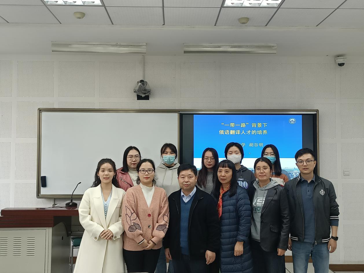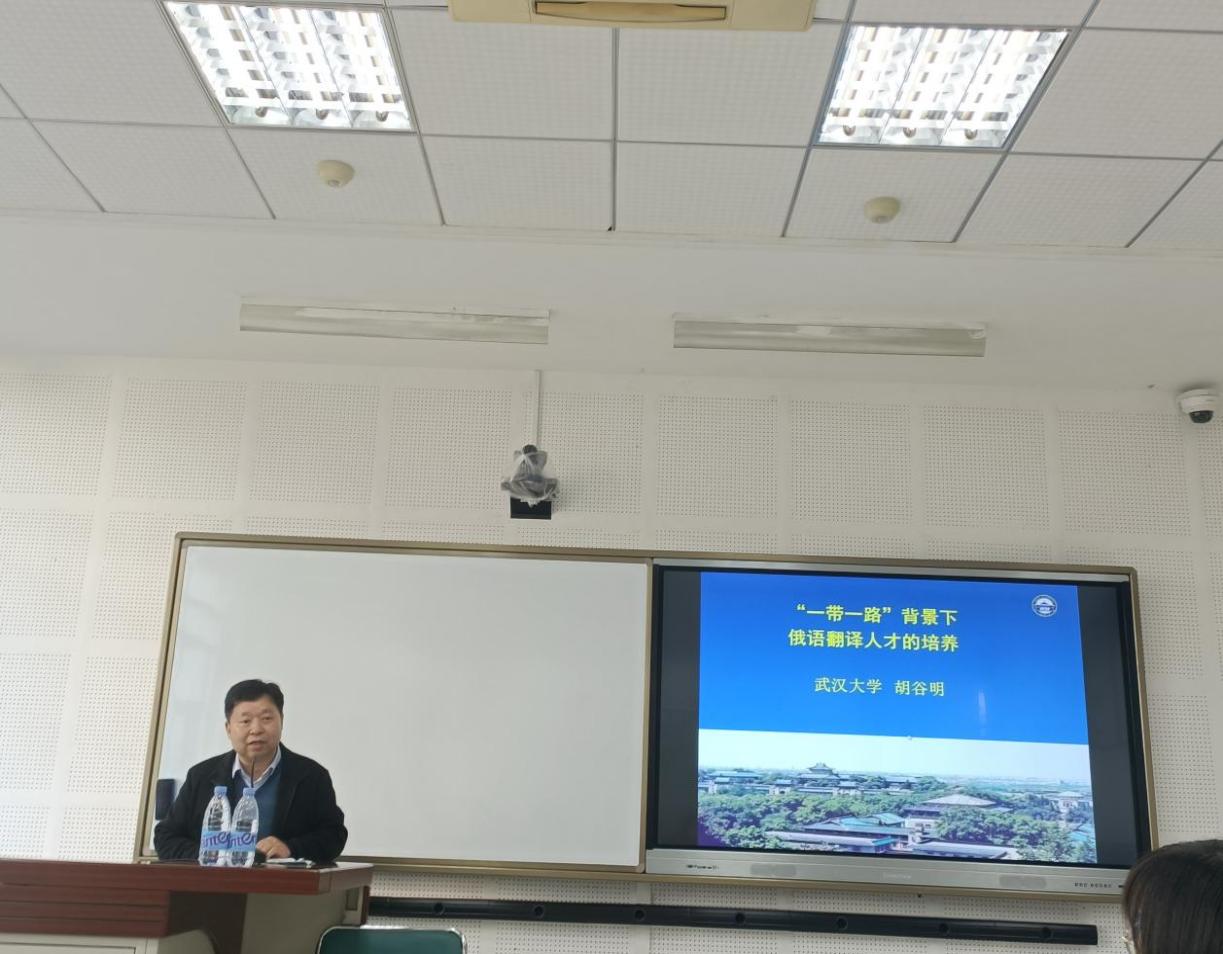 应我院俄语教研室邀请,武汉大学外国语言文学学院教授,博士生导师,湖北省翻译工作者协会常务理事,武汉市翻译协会常务副会长胡谷明在文波语音210为我院师生做了题为“‘一带一路’背景下俄语翻译人才培养”的学术讲座。本次讲座由朱红琼教授主持。
