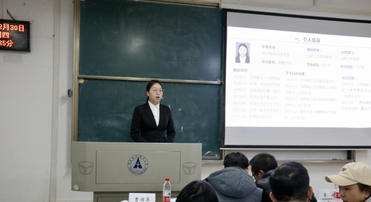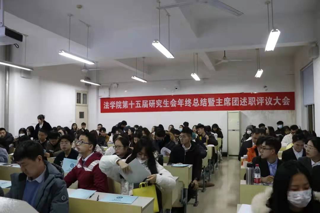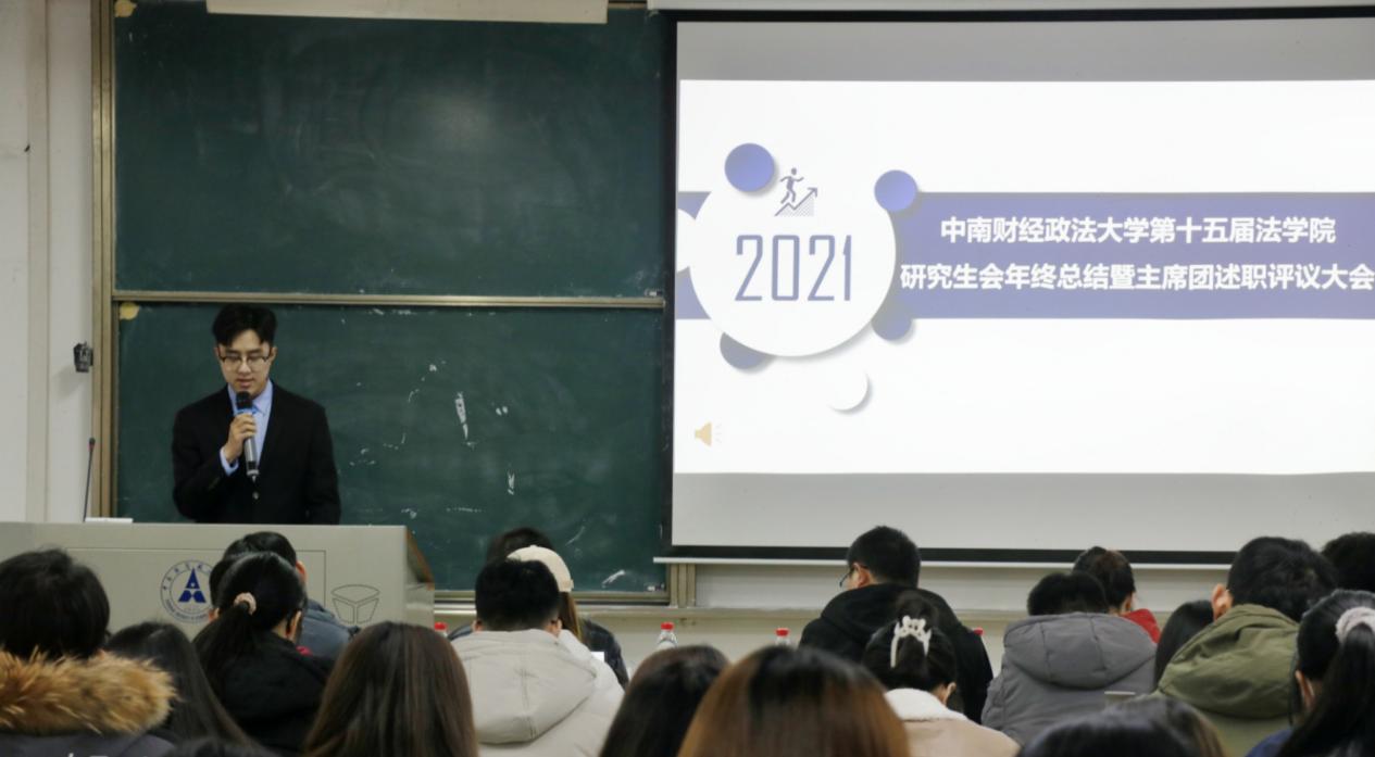 为进一步加强法学院研究生会建设,总结2021年度法学院研究生会各项工作的开展情况,我院研究生会于12月30日在文添楼112教室召开年终总结暨主席团述职评议大会。法学院研究生辅导员胡亚飞老师、张申鹏老师、刘洁老师以及《中南法律评论》编辑部指导老师昝强龙老师出席本次大会。参加大会的还有法学院研究生会各部门成员、《中南法律评论》编辑部成员以及法学院研究生各班级代表。