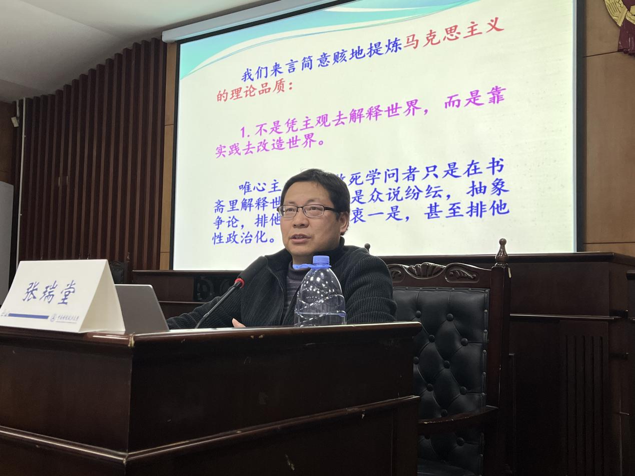 其后,张瑞堂教授为党员同志们深入分析百年党史的科学逻辑,即马克思主义的中国化、时代化和大众化;也即用马克思主义立场、观点和方法,来分析和解决社会发展中不断出现的新问题,创造新的实践和新的理论。同时强调理想一旦确定,就让实践去说话,不要脱离实践去抽象争论。另外,张教授为党员同志总结四条马克思主义理论品质,更加深入领会马克思主义的深刻内涵。